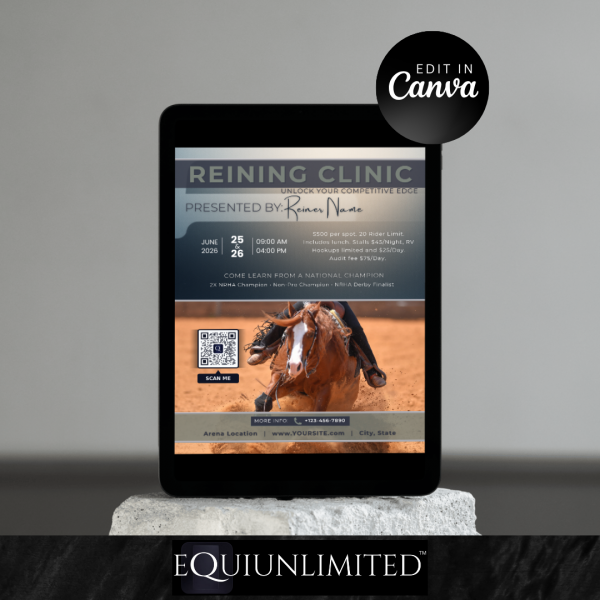 Elevate your next reining clinic with a standout promotional flyer designed specifically for reining clinics. This premium Canva template makes it effortless to create a polished, professional flyer that captures attention both online and in print. Every visual element you see is included and ready to customize right in Canva.