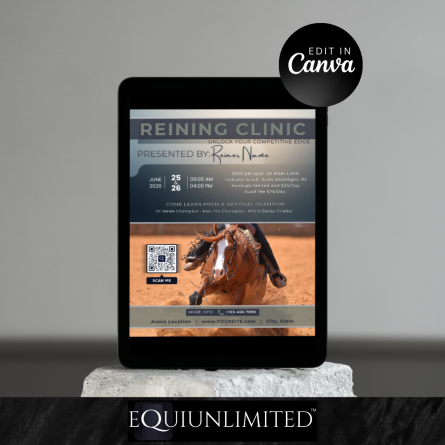 Elevate your next reining clinic with a standout promotional flyer designed specifically for reining clinics. This premium Canva template makes it effortless to create a polished, professional flyer that captures attention both online and in print. Every visual element you see is included and ready to customize right in Canva.